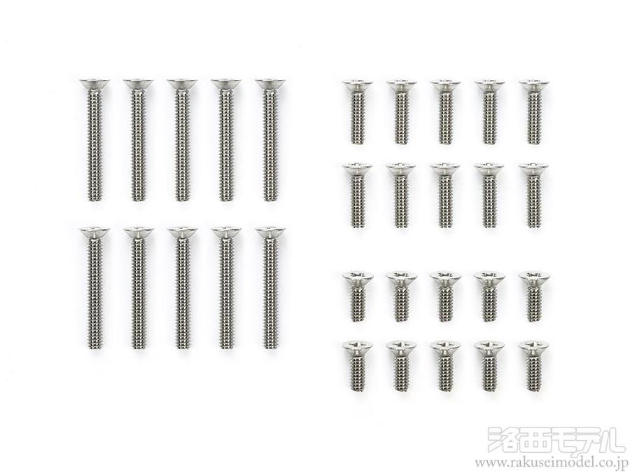 ビスの頭が平らな皿ビスのセットです。シャーシ裏面に取り付けるプレートなどに皿穴加工をすればビスの頭が飛び出ることがなく、スムーズな底面に仕上げられるので、ビスが路面に接触するのを防ぎます。