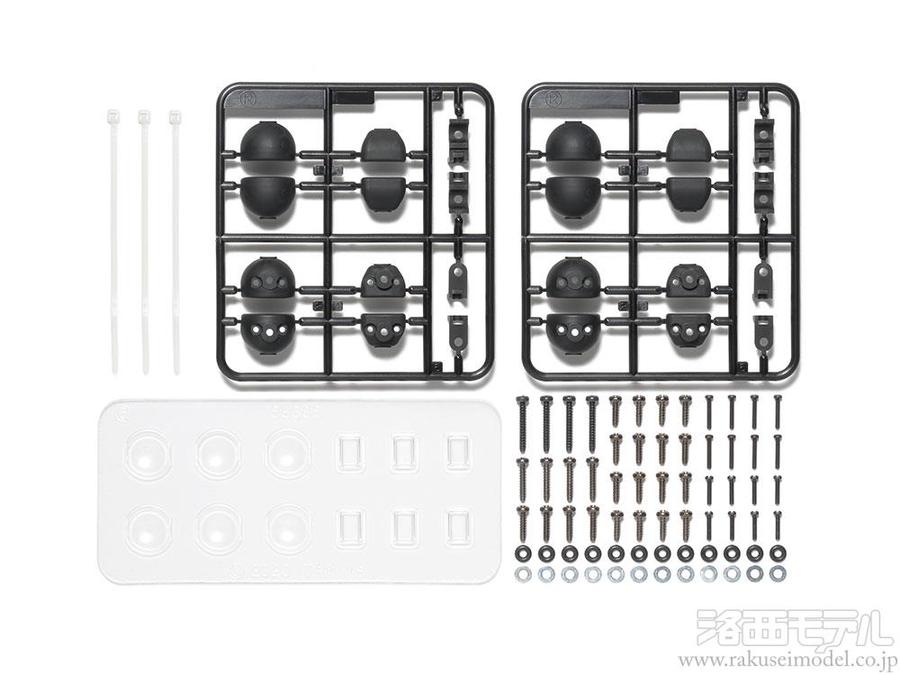 実車のバギーカーにも見られる、丸形と角形の補助ライトポッドを再現しました。樹脂製のポッド本体とポリカーボネート製のレンズで構成。別売のITEM53909 LEDライトユニット(TLU-01)を組み込んで、5mmLEDライトの点灯も可能。 コミカルバギーシリーズのスペアとしてはもちろん、ホーネットやバギーチャンプなどに装着してライト点灯が楽しめます。ビスやワッシャー、ナット類などの固定用部品もセット。