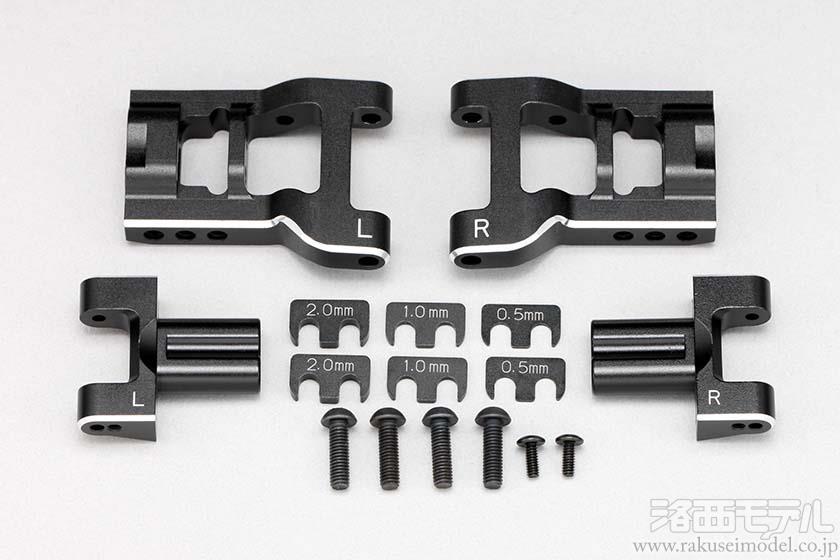 調整用のスペーサー等もセットになっていますので、ボルトオンで交換ができ、走行する路面状況に合わせた詳細なセッティングが短時間で可能です。特にコンペシーンで活躍するユーザーには必須のパーツとなります。また、Hアーム本体はベベルエッジ加工を施したアルミ製ですので、最上級の高級感 & 所有感もご堪能いただけます。