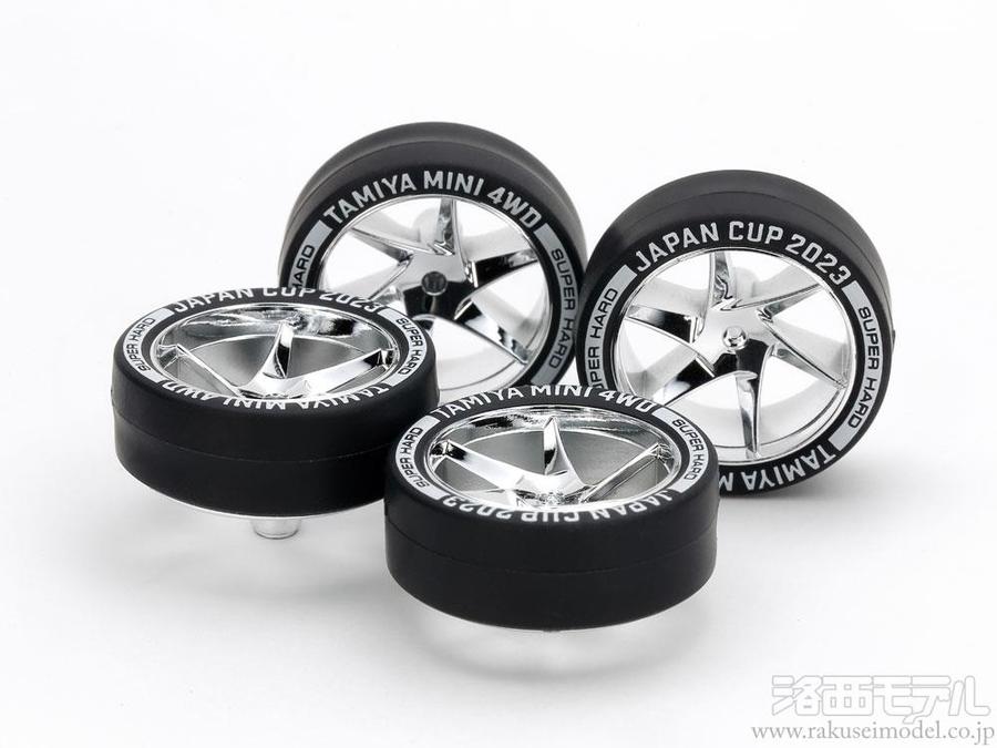 キット標準のタイヤに比べてグリップ力が低く、コーナリング性能に優れたスーパーハードローハイトタイヤと、シルバーメッキを施したスパイラルホイールのセットです。タイヤのサイドウォールにホワイトプリントした、『TAMIYA MINI 4WD/JAPAN CUP 2023』のロゴがレーシーなムードを高め、プレミアム感を演出。