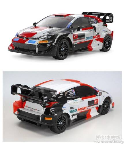 2022年のFIA世界ラリー選手権を戦うために開発され、この年、見事にメーカー&ドライバー&コ・ドライバーのすべてのチャンピオンを獲得したトヨタのラリーカー、ガズーレーシング WRT/GR ヤリス ラリー1 ハイブリッドを再現した電動ラジオコントロールカーの組み立てキットです。市販車のGRヤリスをベースに、サイドスカートや大型リヤウイングに加えて、ハイブリッドユニット冷却用のエアダクトをボディ後部左右に設けた迫力のフォルムをリアルにモデル化。レッドとブラックのグラフィックや、スポンサーロゴはステッカーで用意しました。シャーシはシャフトドライブ4WDのTT-02。ダークガンメタルのフィンホイールに、レーシングラジアルタイヤを装着しました。