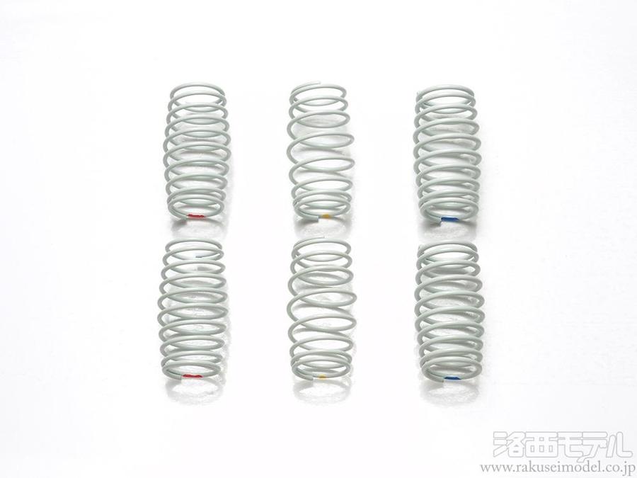 バレル形状(樽型)によりプログレッシブ効果を発揮するスプリングです。クロスカントリーなどで見られる、車体が大きく傾くキャンバー走行では、ノーマルのスプリングに比べて安定した走りが可能。また、ダートでのスピード走行でもロールに対する踏ん張りが利き、安定性がアップします。ソフト、ミディアム、ハードの3種類の固さを用意して、路面や走行フィールドに合わせたセッティングが可能です。