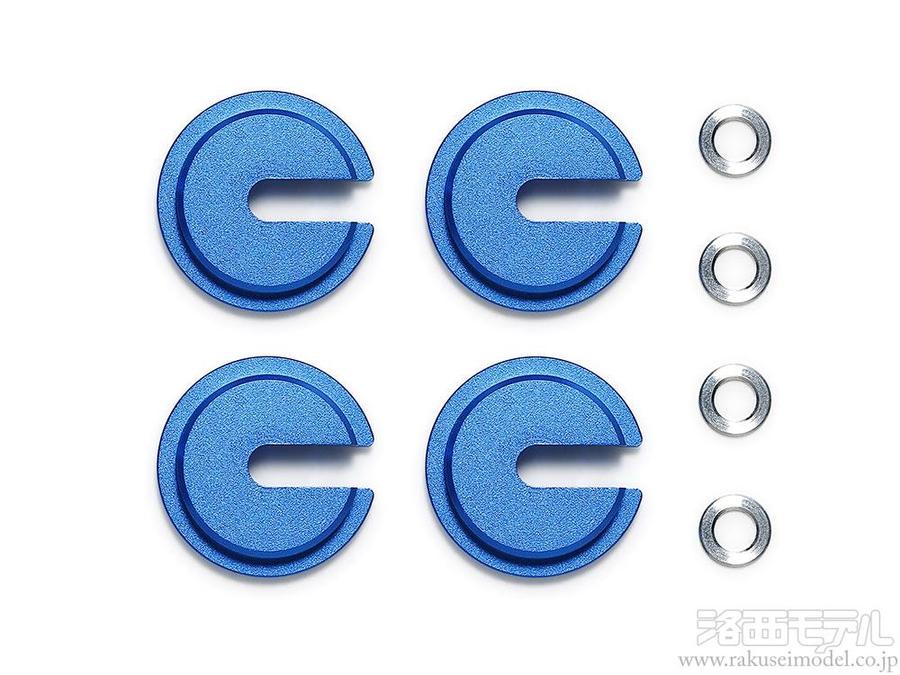 ブルーアルマイト加工されたアルミ切削製リテーナー4個と、5.5×0.5mmアルミスペーサーも4個セット