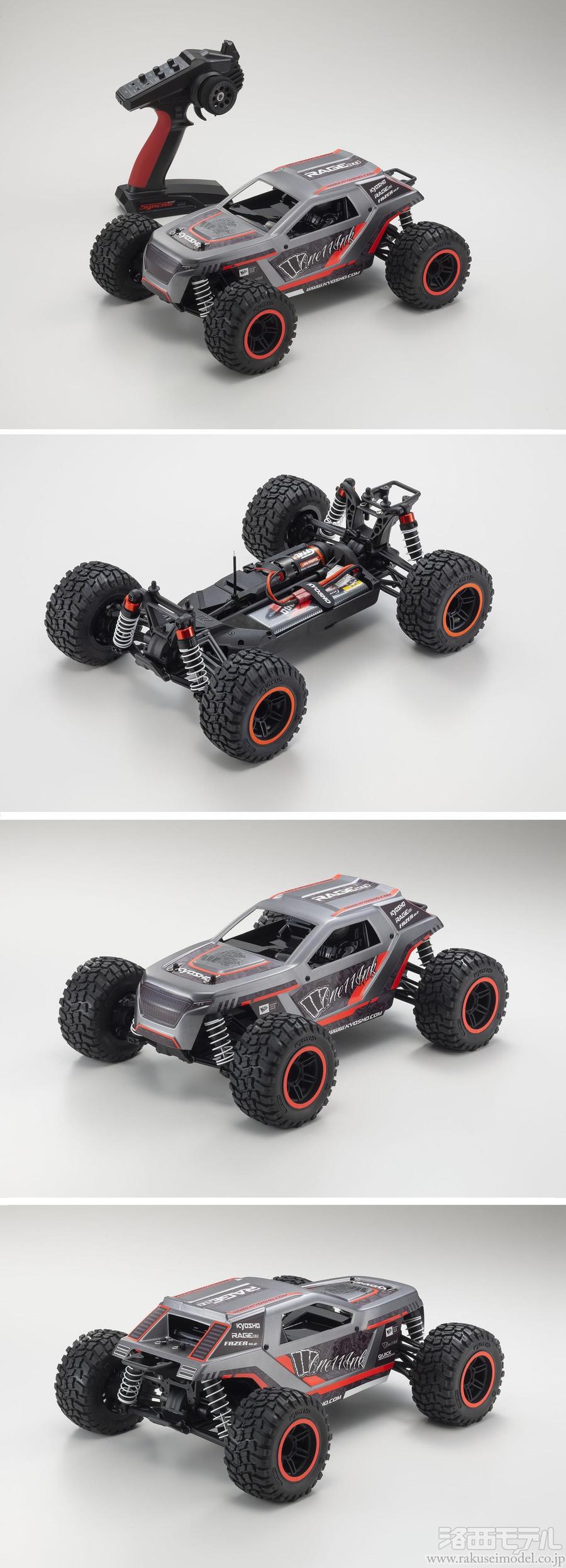 レーシングSUVトラックという新たなカテゴリーを提案するマシンとして登場した『レイジ』が、第2世代を示す“2.0”のネーミングを与えられて大きく進化! コストパフォーマンスと走破性を兼ね備えた従来モデルのコンセプトは受け継いでいるものの、その走行性能にいっそうの磨きがかかりました。パーツ点数を少なくすることでメンテナンス性を高めた軽量シャシーはシンプルなデザインながら、前後のステフナーや各部に設けた補強リブ、そして使用する材質の変更など細部にわたるブラッシュアップで高い強度と走行に適した剛性を確保。加えて、極力シンメトリーとなるようなシャシーデザインとしたことで、前後バランスに優れるサスペンションやオールマイティな特性をもつタイヤ、車格に見合ったパワーソースとの相乗効果によるクセのない素直な操縦性も獲得しています。そのうえでスリッパークラッチ、前後ギヤデフ、オイルダンパー、フルボールベアリングを採用。ラフな走行にも高い耐久性と耐衝撃性を誇り、ドライバーをしっかりとサポートします。しかも、すべてが揃った工場完成のレディセットですので走行用バッテリー、走行用バッテリー用充電器、送信機用電池を別途購入すれば、すぐに走行が可能。オンロードからオフロードまで走る場所を選ぶことなく、どこででも楽しむことができるレイジ2.0でR/Cカーの魅力や楽しさを体感してみてはいかがでしょうか。
