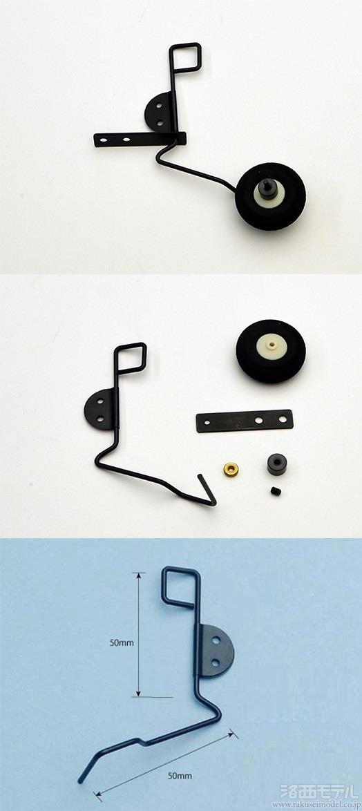 2車輪式の中小型機の尾輪に使用するシンプルなピアノ線製の尾輪支柱と軽量スポンジタイヤのセットです。