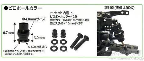 Φ4.8mmサイズのダンパー(TRFダンパー標準サイズ)にお使い頂ける、アルミ製ピロボールカラーです。弊社では、原則メーカーより提供された情報を基に表記をさせて頂いております。稀に商品の詳細がメーカー側より提供されない場合がございますので、ご理解の程よろしくお願い申し上げます