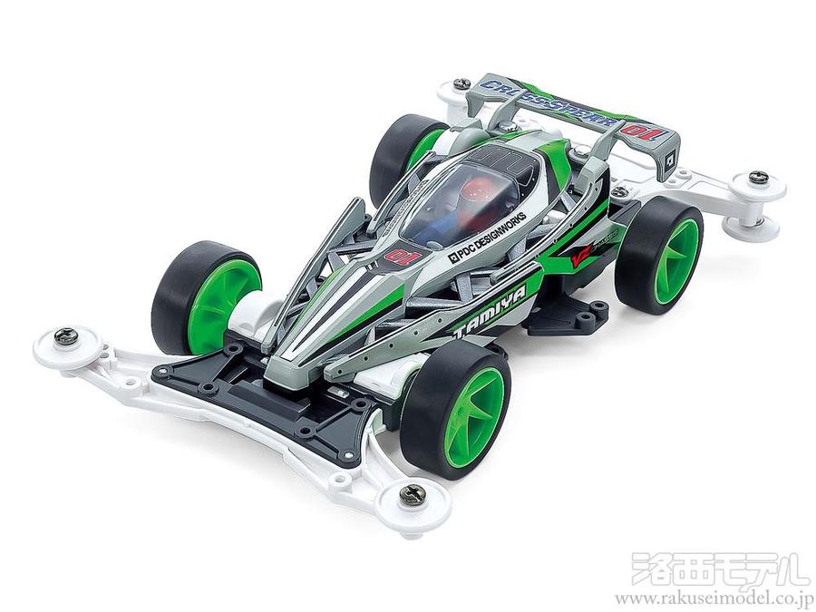 ミニ四駆『レイスピアー』の名前を引き継ぐこのマシンは、車体左右のサイドパネルをセンター部分から離してトラス構造で支えるユニークな形と、スピアー(槍)のような鋭いフォルムが注目です。