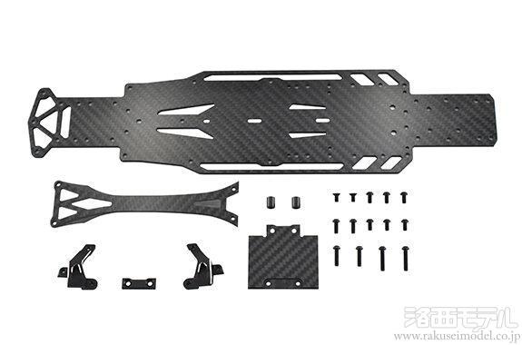 アッパーデッキとバッテリーホルダーの接続部には、キット純正の樹脂製トップデッキを装着している際に使用するアルミ製のリンクプレートと、バッテリーホルダー部の剛性をアップさせるカーボン製のトップデッキの2種類が付属、マシンのトラクションバランスを瞬時に調整頂けます。