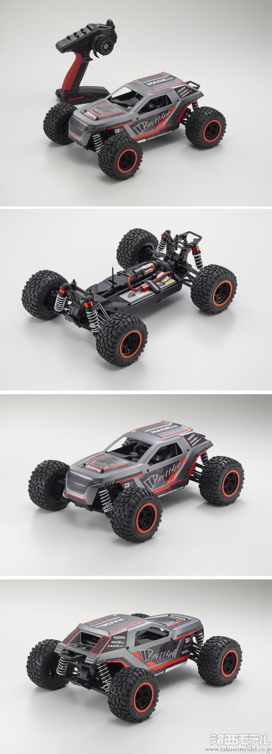 レーシングSUVトラックという新たなカテゴリーを提案するマシンとして登場した『レイジ』が、第2世代を示す“2.0”のネーミングを与えられて大きく進化! コストパフォーマンスと走破性を兼ね備えた従来モデルのコンセプトは受け継いでいるものの、その走行性能にいっそうの磨きがかかりました。パーツ点数を少なくすることでメンテナンス性を高めた軽量シャシーはシンプルなデザインながら、前後のステフナーや各部に設けた補強リブ、そして使用する材質の変更など細部にわたるブラッシュアップで高い強度と走行に適した剛性を確保。加えて、極力シンメトリーとなるようなシャシーデザインとしたことで、前後バランスに優れるサスペンションやオールマイティな特性をもつタイヤ、車格に見合ったパワーソースとの相乗効果によるクセのない素直な操縦性も獲得しています。そのうえでスリッパークラッチ、前後ギヤデフ、オイルダンパー、フルボールベアリングを採用。ラフな走行にも高い耐久性と耐衝撃性を誇り、ドライバーをしっかりとサポートします。しかも、すべてが揃った工場完成のレディセットですので走行用バッテリー、走行用バッテリー用充電器、送信機用電池を別途購入すれば、すぐに走行が可能。オンロードからオフロードまで走る場所を選ぶことなく、どこででも楽しむことができるレイジ2.0でR/Cカーの魅力や楽しさを体感してみてはいかがでしょうか。