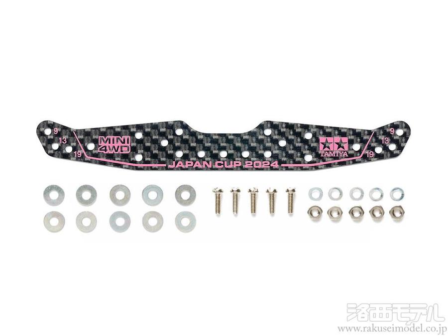 レーシーなカーボンパターンに、タミヤマークやJ-CUPのロゴなどをピンクでプリントしたデザインも注目です。