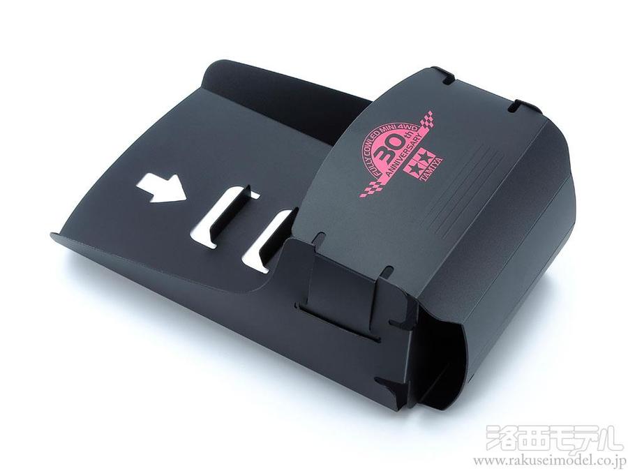 色はブラック、フルカウルミニ四駆30周年記念ロゴとタミヤマークをピンクでプリントしました。