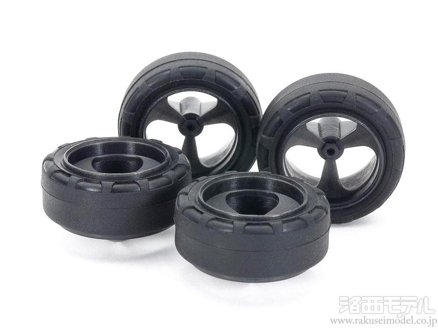 スピード調整や低重心化に有効な24mmの小径タイヤは、グリップ力の低さが特徴の合成ゴム製。