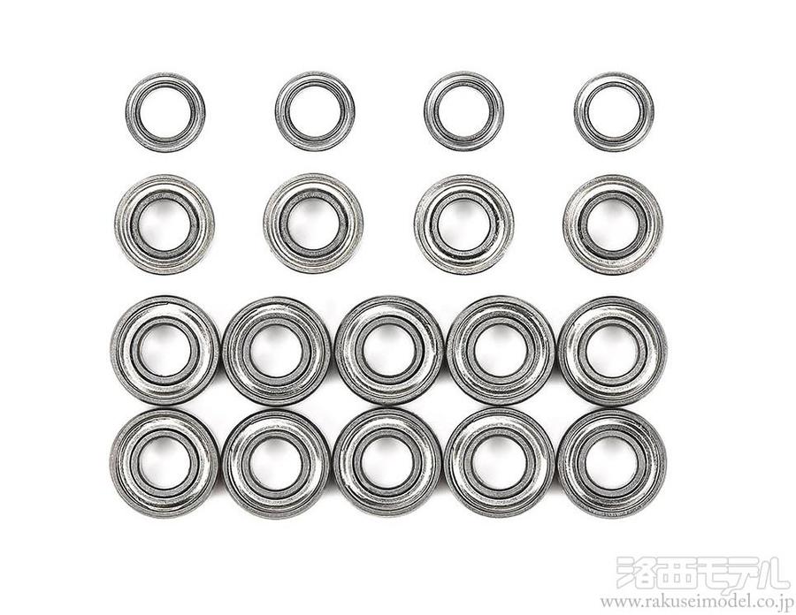 ボールベアリングの装備はチューンナップの第1歩。駆動ロスを減らして走行時間をのばし、軸受け部分の耐久性も高めます。また、ステアリング系の軸受け用ボールベアリング(850)もセットして、いっそうスムーズな操作が楽しめます。