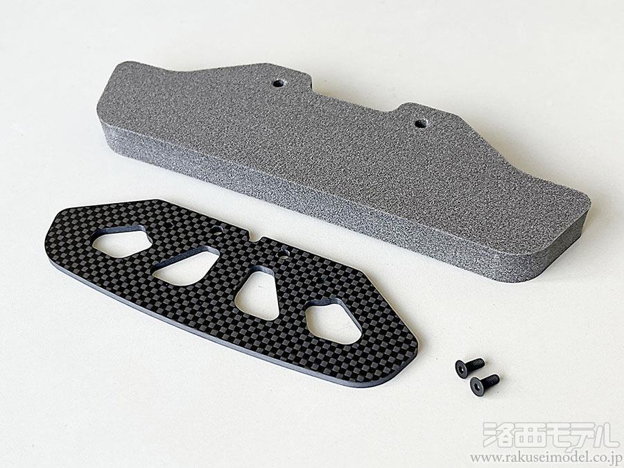 ウレタンバンパーの垂れ下がりの防止とシャーシ、足回りの保護に貢献するカーボンバンパーのセットです。