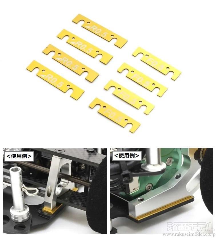 前後のアクスルマウントとシャシーの間に挟んでそれぞれ0.5mm、1.0mmの2段階に車高を下げる事が可能。
