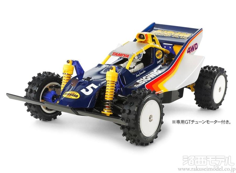 日本を代表するレーシングカーデザイナーとして、テレビコマーシャルにも出演。「空気が見える男」と呼ばれた由良拓也氏がボディデザインを担当して大きな話題となった、タミヤ電動RCカー誕生10周年記念モデル、4WDレーシングバギー ビッグウィッグ。1986年に発売された当時の基本構成を変えることなく、改良を加えた復刻版がビッグウィッグ(2017)です。スリムなスタイルが主流だったそれまでのバギーボディから一転。空気をスムーズに流し、ダウンフォースを生み出すボリューム感あふれるエアロダイナミックボディは今でも十分個性的。マーキングは当時のイメージを踏襲しつつ、リヤウイングに由良氏が代表を務めるレーシングカー製作会社「ムーンクラフト」のロゴマークを大きく配置したのがポイントです。