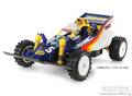 日本を代表するレーシングカーデザイナーとして、テレビコマーシャルにも出演。「空気が見える男」と呼ばれた由良拓也氏がボディデザインを担当して大きな話題となった、タミヤ電動RCカー誕生10周年記念モデル、4WDレーシングバギー ビッグウィッグ。1986年に発売された当時の基本構成を変えることなく、改良を加えた復刻版がビッグウィッグ(2017)です。スリムなスタイルが主流だったそれまでのバギーボディから一転。空気をスムーズに流し、ダウンフォースを生み出すボリューム感あふれるエアロダイナミックボディは今でも十分個性的。マーキングは当時のイメージを踏襲しつつ、リヤウイングに由良氏が代表を務めるレーシングカー製作会社「ムーンクラフト」のロゴマークを大きく配置したのがポイントです。