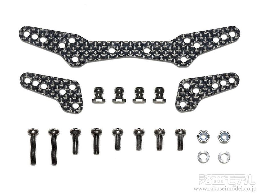 標準装備の樹脂製ステーに換えて使用する、軽量・高剛性の3mm厚カーボン製ダンパーステー。ダンパーの作動効果をアップして質の高い走りを発揮。また、ダンパーの取付箇所を複数配置して、より細かなセッティングが可能です。左右一体型のフロント用、左右分離型のリヤ用の1台分をセットしました。