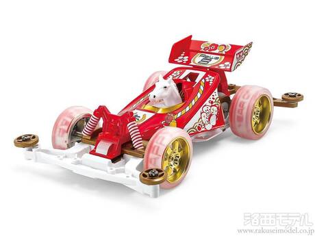 シャフトドライブ四輪駆動を採用した高性能レーサーのプラスチックモデル組み立てキットです。「干支ミニ四駆」は毎年年末に発売される、新年を祝う特別なマシン。2026年の干支「午(うま)」がハンドルを握るのが干支ミニ四駆「午年」です。くさび形のエアロフォルムと、大きなリヤウイングが目を引くオープントップボディはビビッドなレッド。専用ステッカーで梅を描いたマーキングや、コクピットを囲む組紐などが神聖なムードを高めます。さらに、ドライバーは神様の乗り物として神社に奉納され、五穀豊穣や無病息災を祈願する生き物としても知られる白馬。組み立て・塗装ずみで用意したのもポイントです。シャーシは高性能な走りを発揮し、セッティングやカスタマイズも楽しいスーパーIIを採用。本体はホワイト、足まわりはゴールドとし、レッドのボディとあわせた紅白・金カラーでコーディネート。レースはもちろん、飾っておくだけでも楽しめるスペシャルマシンです。