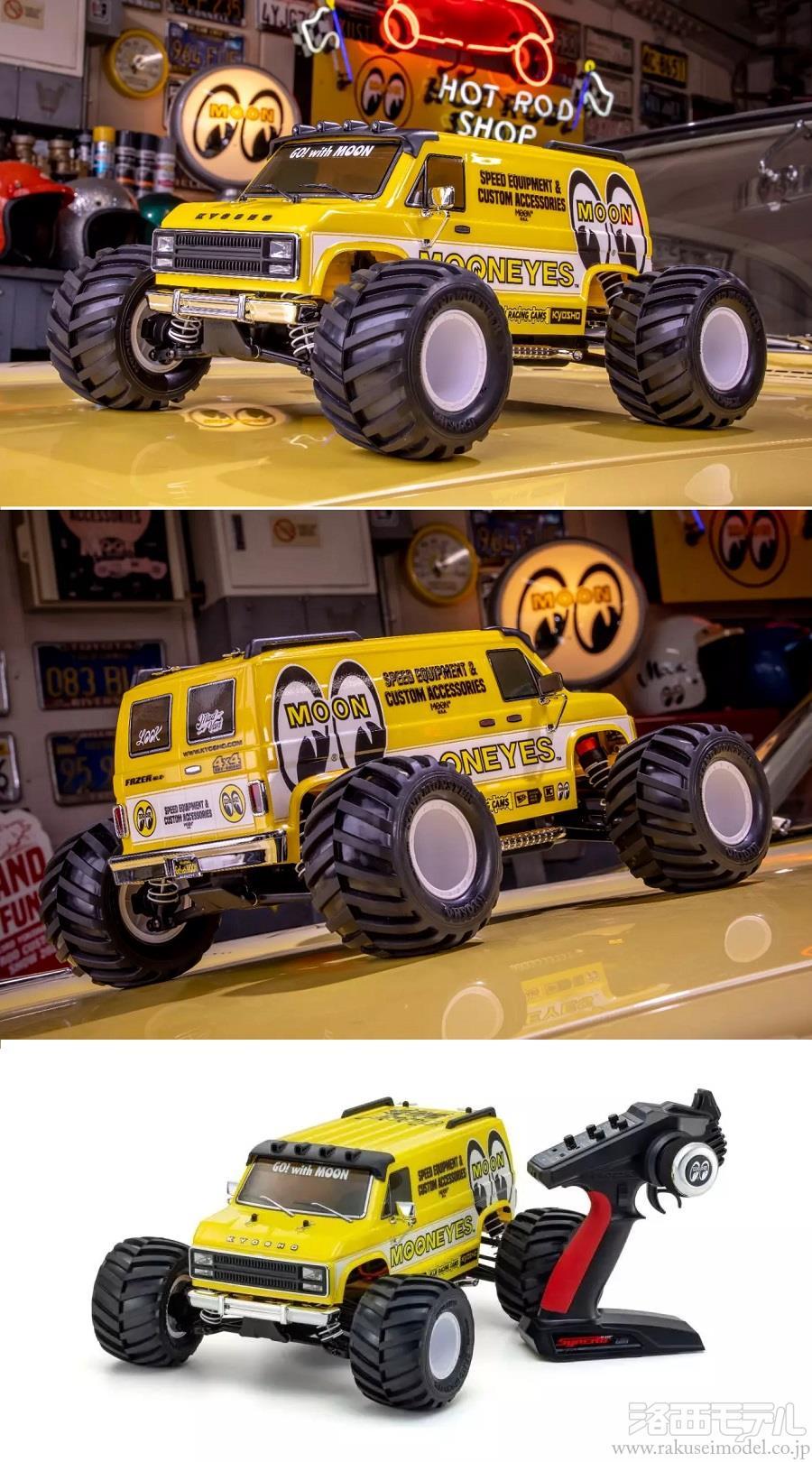 誰もが憧れた古き良きアメリカンフルサイズバンの象徴的なスタイル。そのファニーでノスタルジックなボディに、MOONEYES(ムーンアイズ)のアイコニックなカラーリングと熱いカスタムスピリットを宿した「マッドバン ウィズ ムーンアイズ」が登場。R/Cカーの速い・遅いにとらわれることなく、純粋に走る楽しさだけを追い求めた究極のファンモデルです。ボディの随所には、MOONEYESとのコラボレーションを物語る特別なアイテムやディテールを身に纏い、所有する喜びを高めます。そして、FZ02L-BTシャシーはメンテナンス性を高めるためにパーツ点数を極限まで絞り込みながらも、走行性能に必要な高い強度と剛性を徹底的に追求。シンプルなデザインの裏側には、前後ステフナーや各所に設けた補強リブ、使用する材料の吟味などによって走行に適した高い強度と剛性を確保。加えて、極力シンメトリーとなるようなデザインを採用することで、前後バランスに優れるサスペンションや車格に見合ったパワーソースとの相乗効果によるクセのない素直な操縦性も獲得。そのうえで前後ギヤデフ、オイルダンパー、フルボールベアリングを採用。高い耐久性と耐衝撃性も確保して、ドライバーを確実にサポート。また、ソフトコンパウンドやインナースポンジを採用して高いグリップ力を確保したオールマイティな特性をもつ大径&ワイドタイヤは、ショルダー形状が適度にラウンドしていることもあってオフロード走行はもちろん、オンロード走行でも高い走破性を発揮。すべてが工場で完成しているレディセットですので、走行用バッテリー/走行用バッテリー用充電器/送信機用単3電池4本を別途購入すれば、すぐに胸躍る走行体験をお楽しみいただけます。カリフォルニアの自由なスピリットを体現したMOONEYES仕様のマッドバン。そのファニーで愛嬌のあるルックスの裏側には、本格的な走りを存分に楽しめるシャシー性能が隠されています。さあ、道なき道を駆け抜けて、最高のR/Cカーライフを謳歌してください。