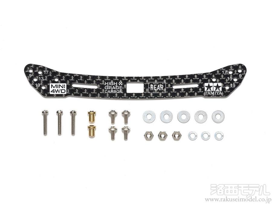 高い剛性を持つ2mm厚のカーボン製リヤ用ワイドプレートです。9、13、17、19mmのローラーをレギュレーションいっぱいの幅で取り付けられる穴を開けました。さらにローラーステーとしてはもちろん、ITEM15467 リヤワイドスライドダンパーのアルミステーと置き換えての使用も可能です。レーシーな雰囲気を高めるカーボン模様に加えて、タミヤマークやミニ四駆のロゴをホワイトでプリントしました。ME、MA、MS、VZ、AR、VS、スーパーUシャーシ各車に使えます。※本製品のみではスライドしません。※印刷が取れるため、クリーナー等は使わないでください。